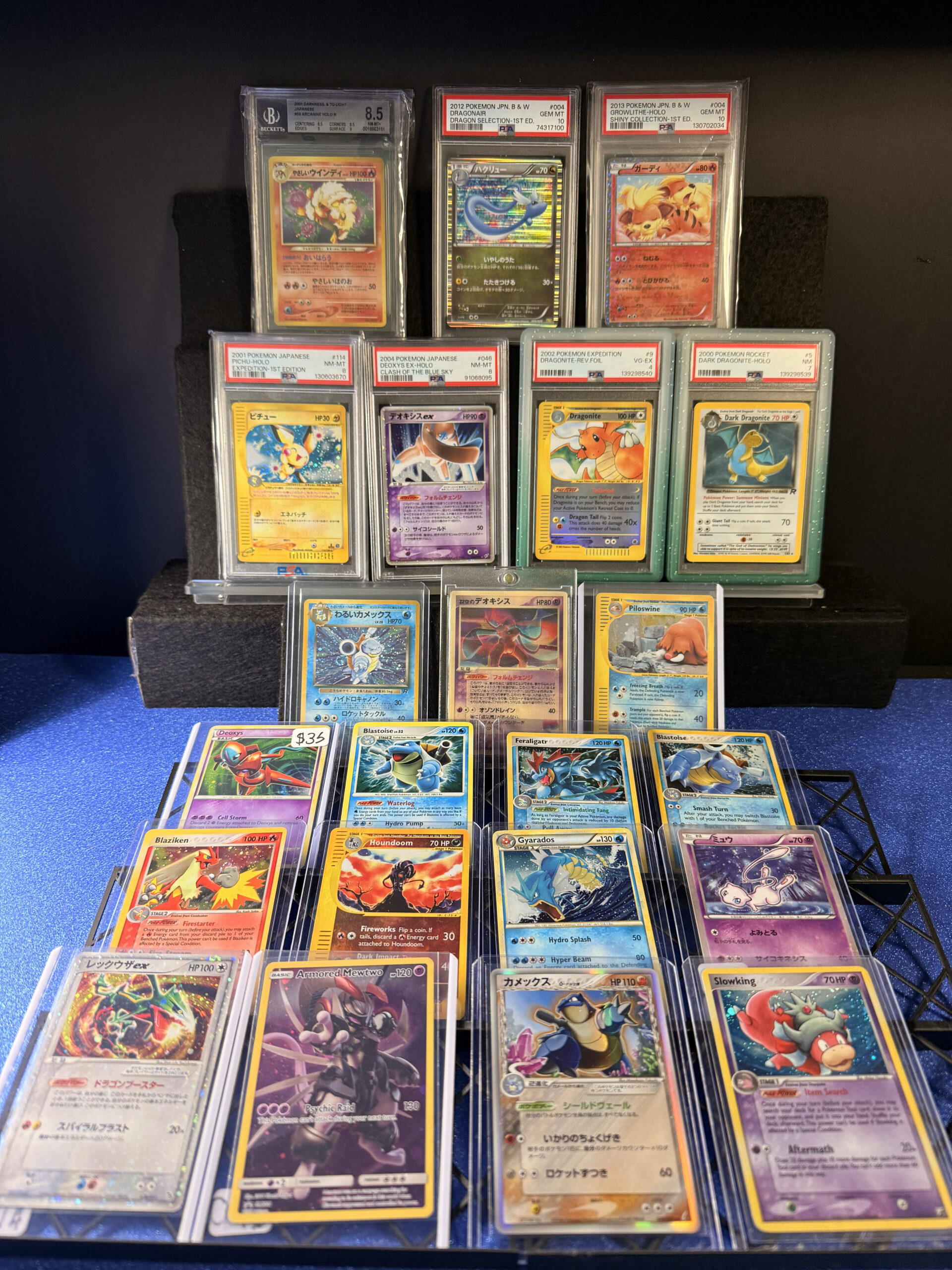 At the booth, you’ll find vintage, mid-era, and modern Pokémon cards in both English and Japanese 🇯🇵, along with playable One Piece and Gundam TCG cards 🏴☠️. They’re also growing their selection of Japanese Pokémon sealed products 🏆.